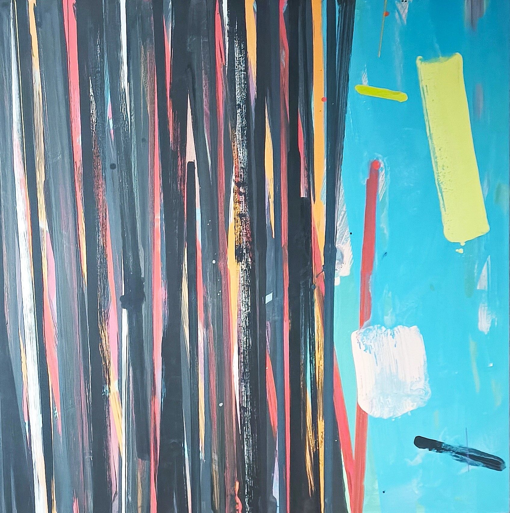 Ich fange mit einem Pinselstrich in einer Ausgangsfarbe an. Dann setze ich Striche in einer weiteren Farbe dazu. Am Ende ist es schwierig zu enträtseln, wie viele Farbnuancen tatsächlich in dem Bild stecken und welcher der leuchtend grünen, gelben, roten oder blauen Striche über oder unter den anderen verläuft. Ich habe eine Idee, wenn ich anfange zu malen. Aber während ich male, entwickelt sich das Bild weiter, und ich passe meine Idee dieser Entwicklung an. Das Leben ist nicht so festgelegt, meine Malerei auch nicht.