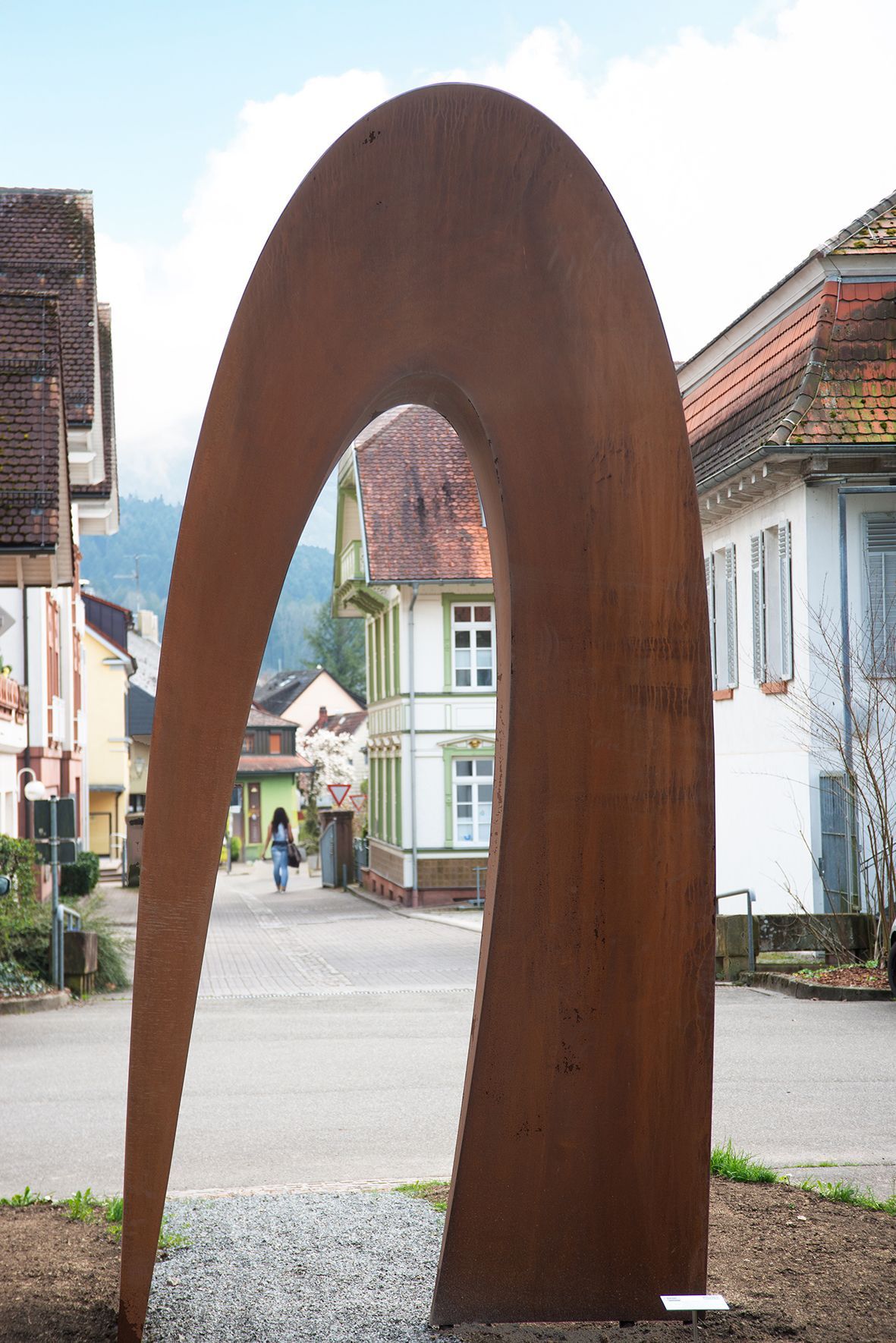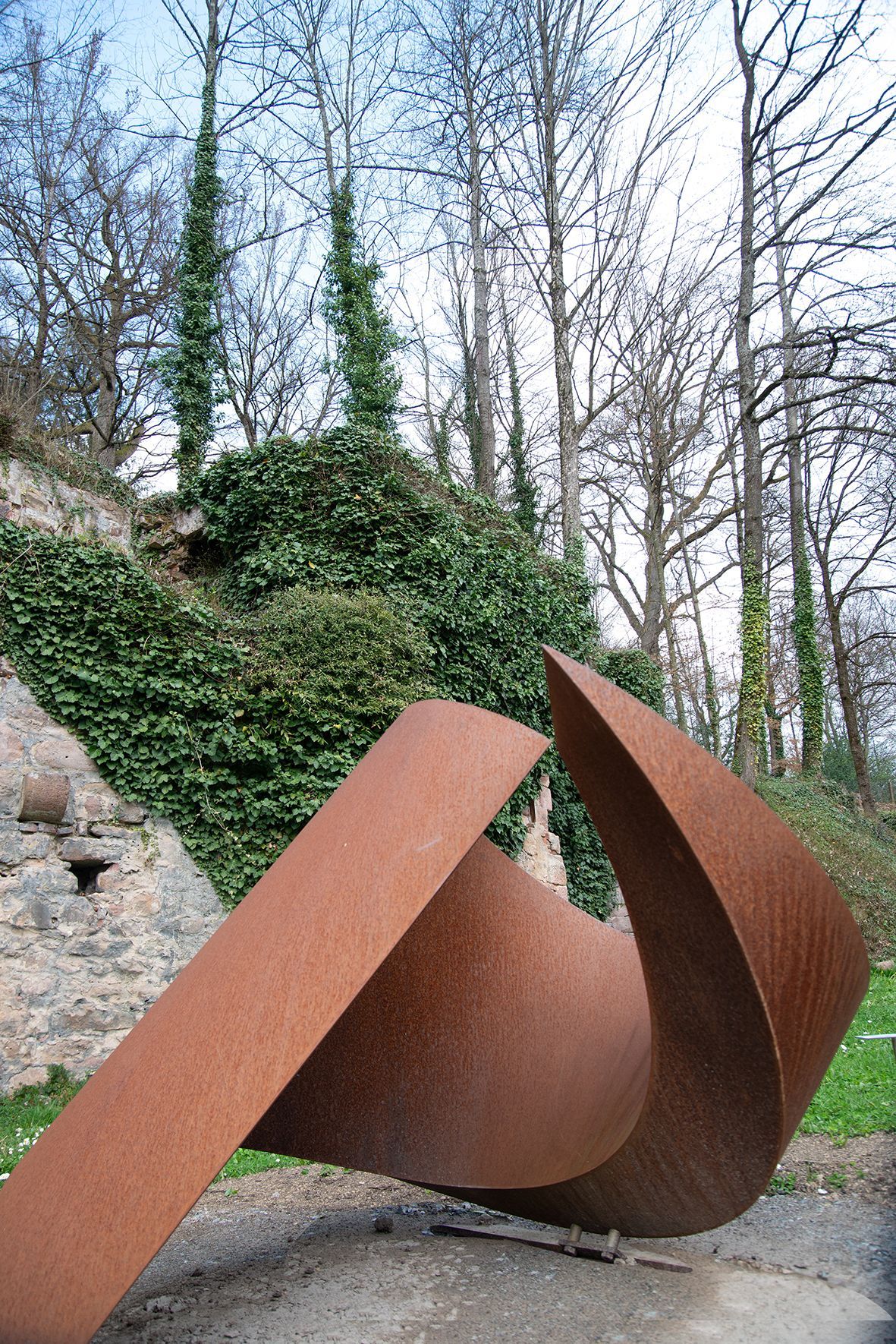 Die bewusste Asymmetrie verschiebt den Schwerpunkt, wodurch die Skulptur eine faszinierende Leichtigkeit erhält, obwohl sie aus massivem Cortenstahl besteht. Auf ihrer Spitze ruhend, besitzt sie eine erstaunliche Dynamik, fast als wolle sie sich in Bewegung setzen.