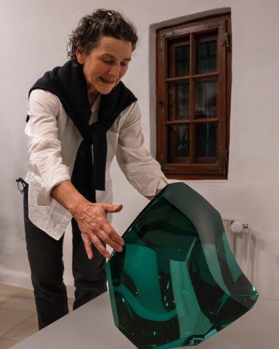 Eines der gewichtigsten Kunstwerke bei den Zeller Kunstwegen bringt die im Hochschwarzwald lebende, 1963 geborene Mechthild Ehmann nach Zell. Zahlreiche Preise, u.a. ist Ehmann mehrfach Preisträgerin beim Salon des Artistes Français im Grand Palais in Paris, unterstreichen ihre hohe Qualität in der Stein- und Bronzebearbeitung. Der rund 3,5 Tonnen schwere Kopf, am hinteren Ausgang des Kurparks in Zell positioniert, besteht aus poliertem Granit. Reduziert in der Form, abstrahiert das Kunstwerk einen menschlichen Kopf: Stirnfläche, Nackenanschnitt, abgeflachte Seite. Der Stein poliert, die Maserung des Materials herausgearbeitet, meisterlich. Den rohen Stein in ein eigenständiges und in sich geschlossenes Subjekt zu verwandeln, dabei das Material und seine Eigenart zu würdigen und zur Geltung zu bringen – das ist das Thema der an der Dombauhütte in Schwäbisch